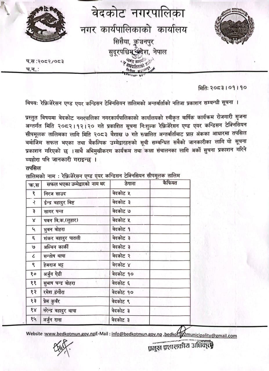 एयर कण्डिसन टेक्निसियन तालिमका लागी छनोट भएका उम्मेदवारहरुको नामावली प्रकाशन सम्बन्धी सूचना।