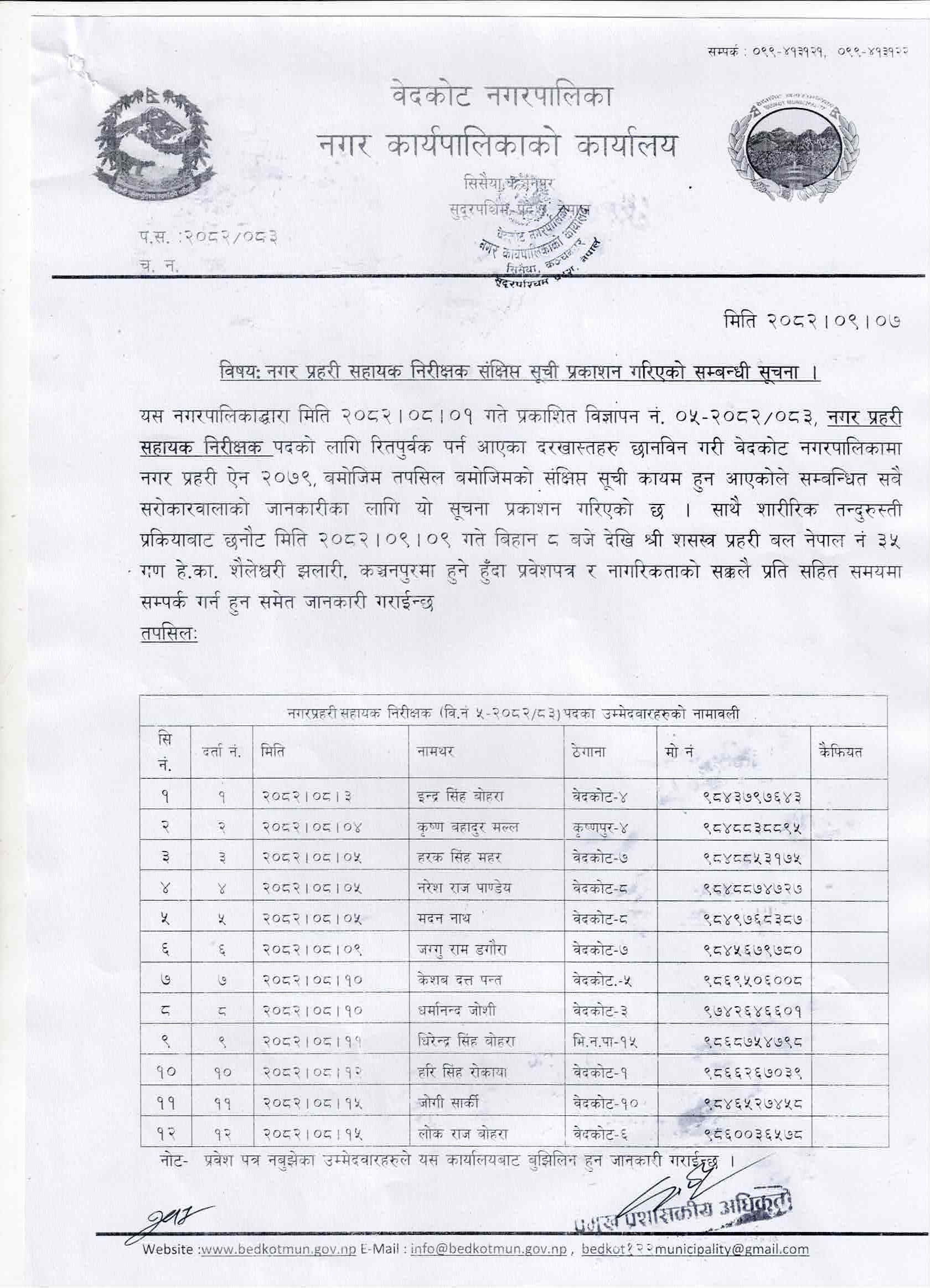 नगर प्रहरी पदको संक्षिप्त सूची प्रकाशन गरिएको सम्बन्धमा।