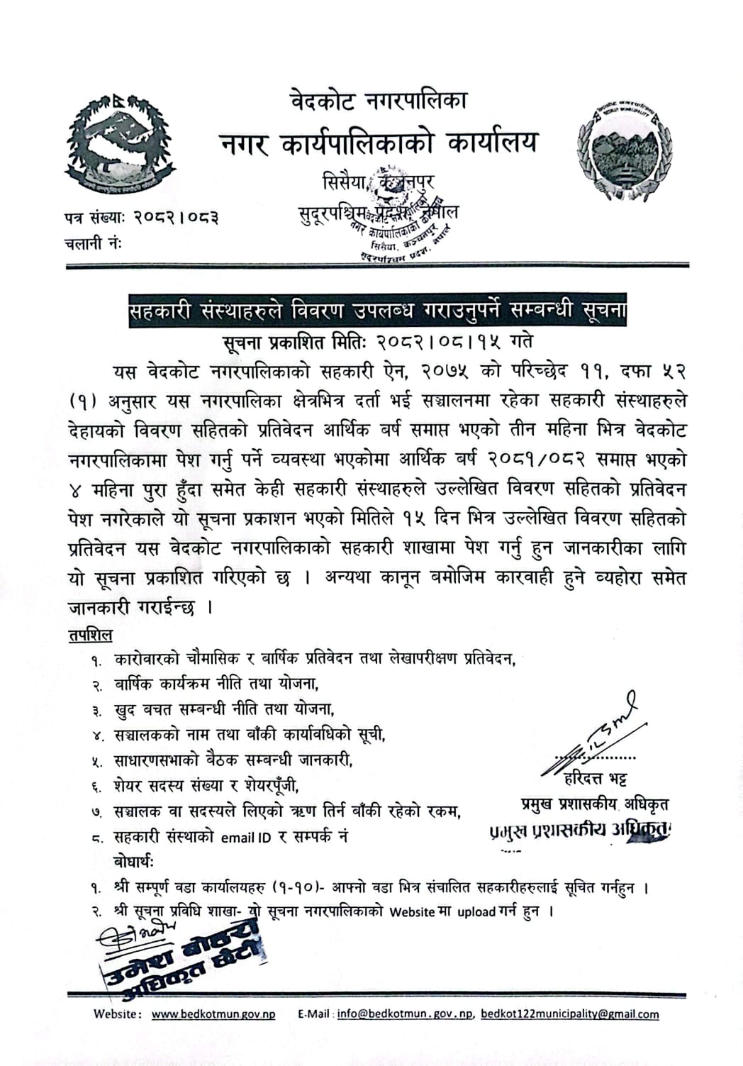 » सहकारी संस्थाहरुले विवरण उपलब्धपर्ने सम्बन्धी सूचना ।