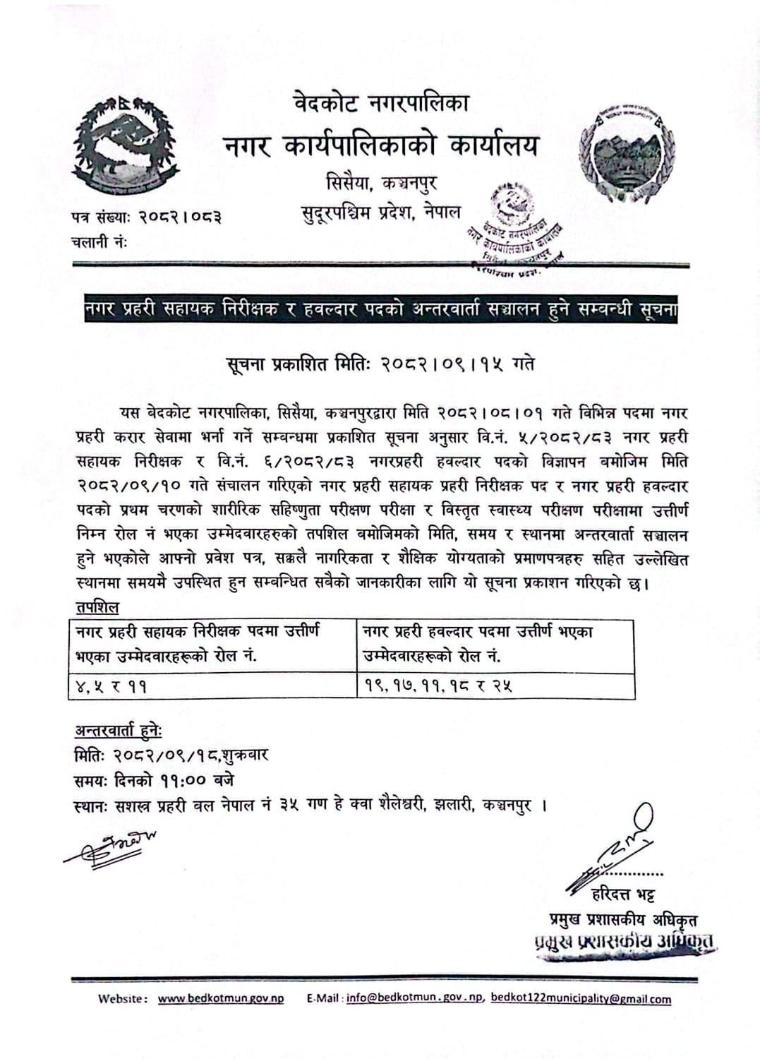 नगर प्रहरी सहायक निरीक्षक र हवल्दार पदको अन्तरवार्ता संचालन हुने सम्बन्धी सूचना।